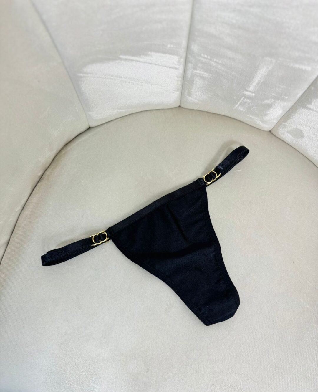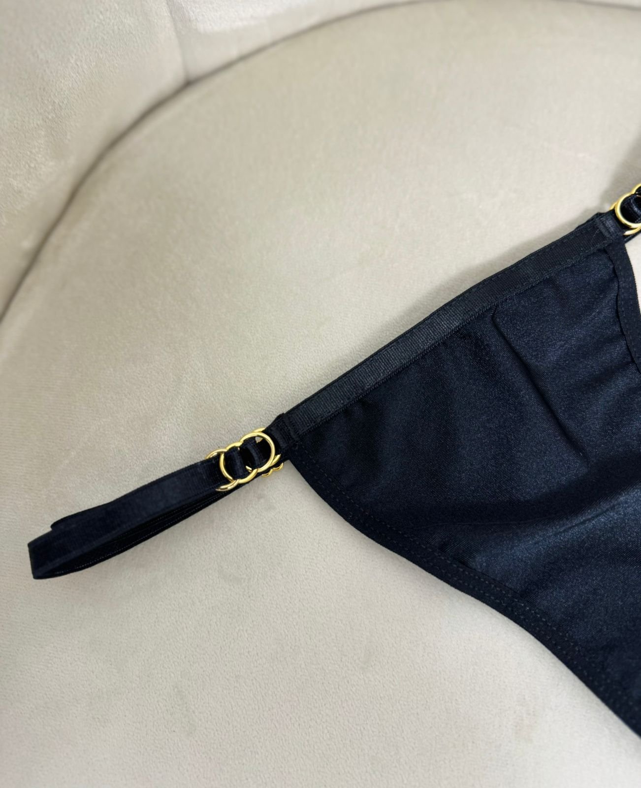 Diseño ajustable y cómodo, en talla única que se adapta desde la S hasta la L. Hecho en tela licra cristal, con herrajes con baño en oro que aportan un toque elegante y exclusivo.